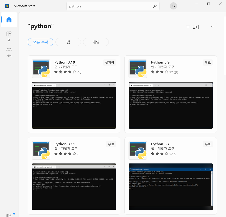 2) 커맨드창에 python이라고 치면 윈도우의 스토어가 뜬다. 이걸 설치하자
