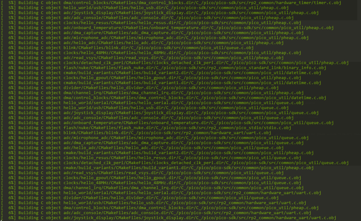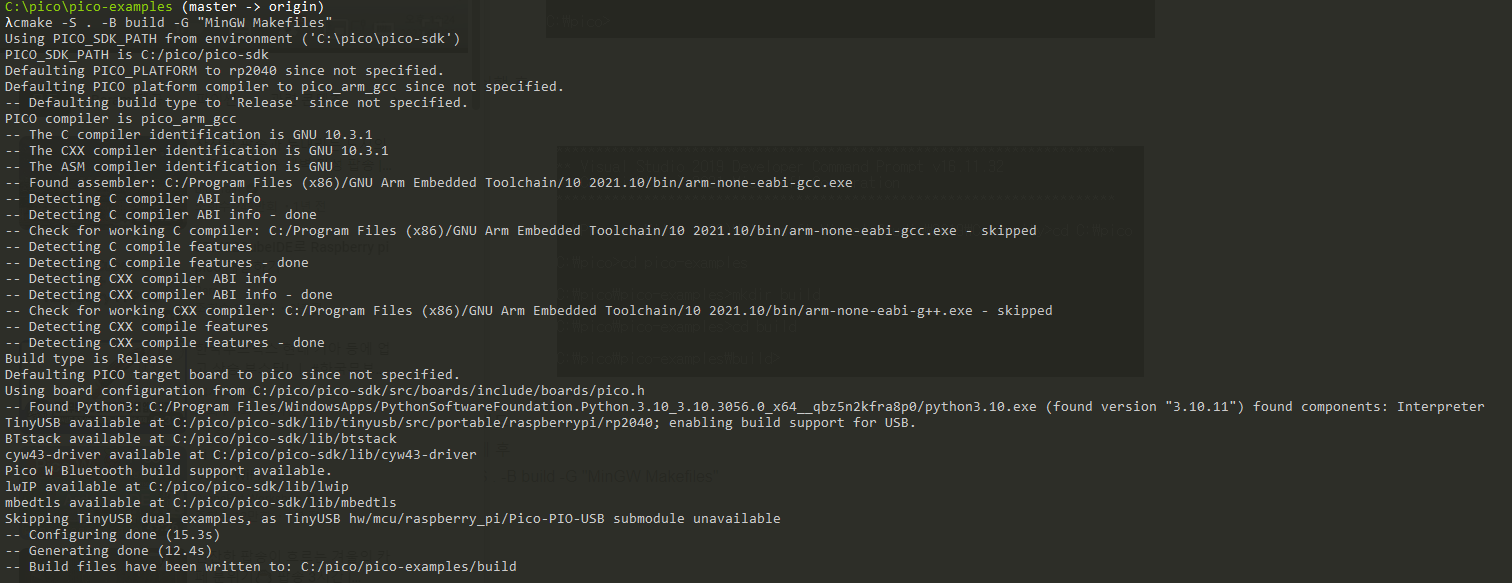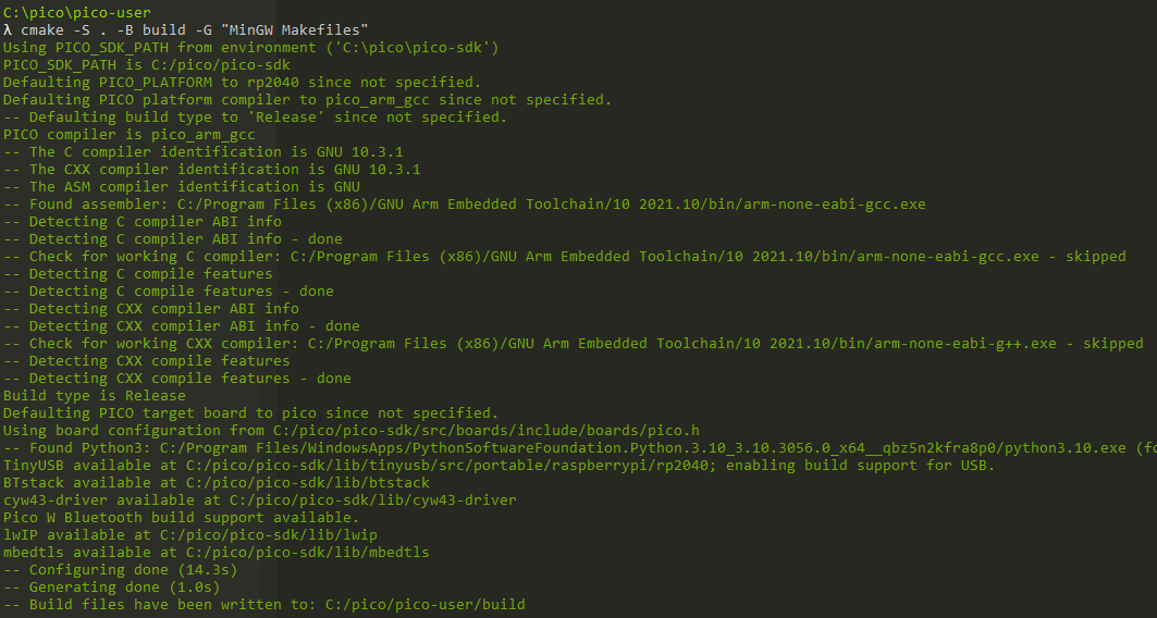 cmake_minimum_required(VERSION 3.12) # Pull in SDK (must be before project) include(pico_sdk_import.cmake) project(pico-user C CXX ASM) set(CMAKE_C_STANDARD 11) set(CMAKE_CXX_STANDARD 17) if (PICO_SDK_VERSION_STRING VERSION_LESS "1.3.0") message(FATAL_ERROR "Raspberry Pi Pico SDK version 1.3.0 (or later) required. Your version is ${PICO_SDK_VERSION_STRING}") endif() # Initialize the SDK pico_sdk_init() # Add project add_subdirectory(src) add_compile_options(-Wall -Wno-format # int != int32_t as far as the compiler is concerned because gcc has int32_t as long int -Wno-unused-function # we have some for the docs that aren't called ) if (CMAKE_C_COMPILER_ID STREQUAL "GNU") add_compile_options(-Wno-maybe-uninitialized) endif()이후 빌드 파일 생성