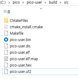 add_executable(pico-user main.c ) # pull in common dependencies target_link_libraries(pico-user pico_stdlib) # create map/bin/hex/uf2 file etc. pico_add_extra_outputs(pico-user)pico-user 내의 CMakeLists