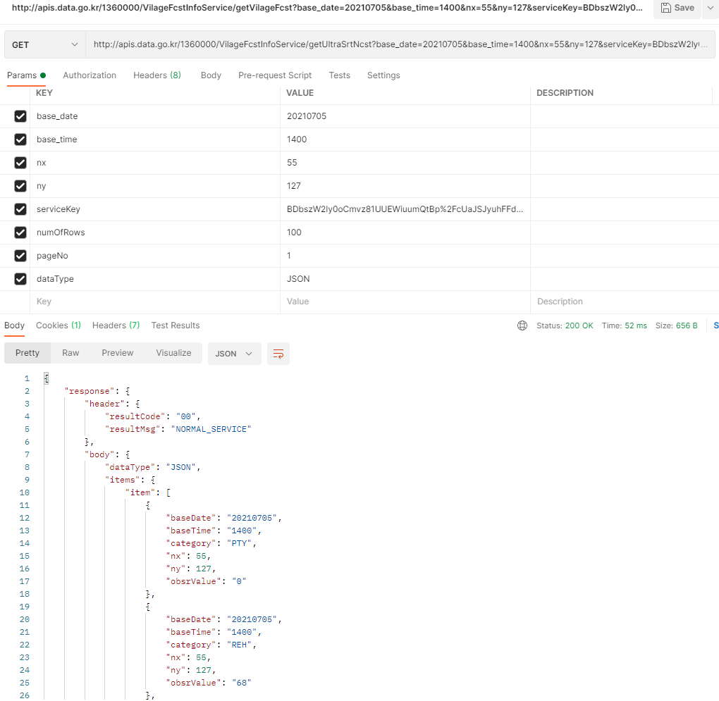 - 강수형태(PTY) 코드 : 없음(0), 비(1), 비/눈(2), 눈(3), 소나기(4), 빗방울(5), 빗방울/눈날림(6), 눈날림(7)